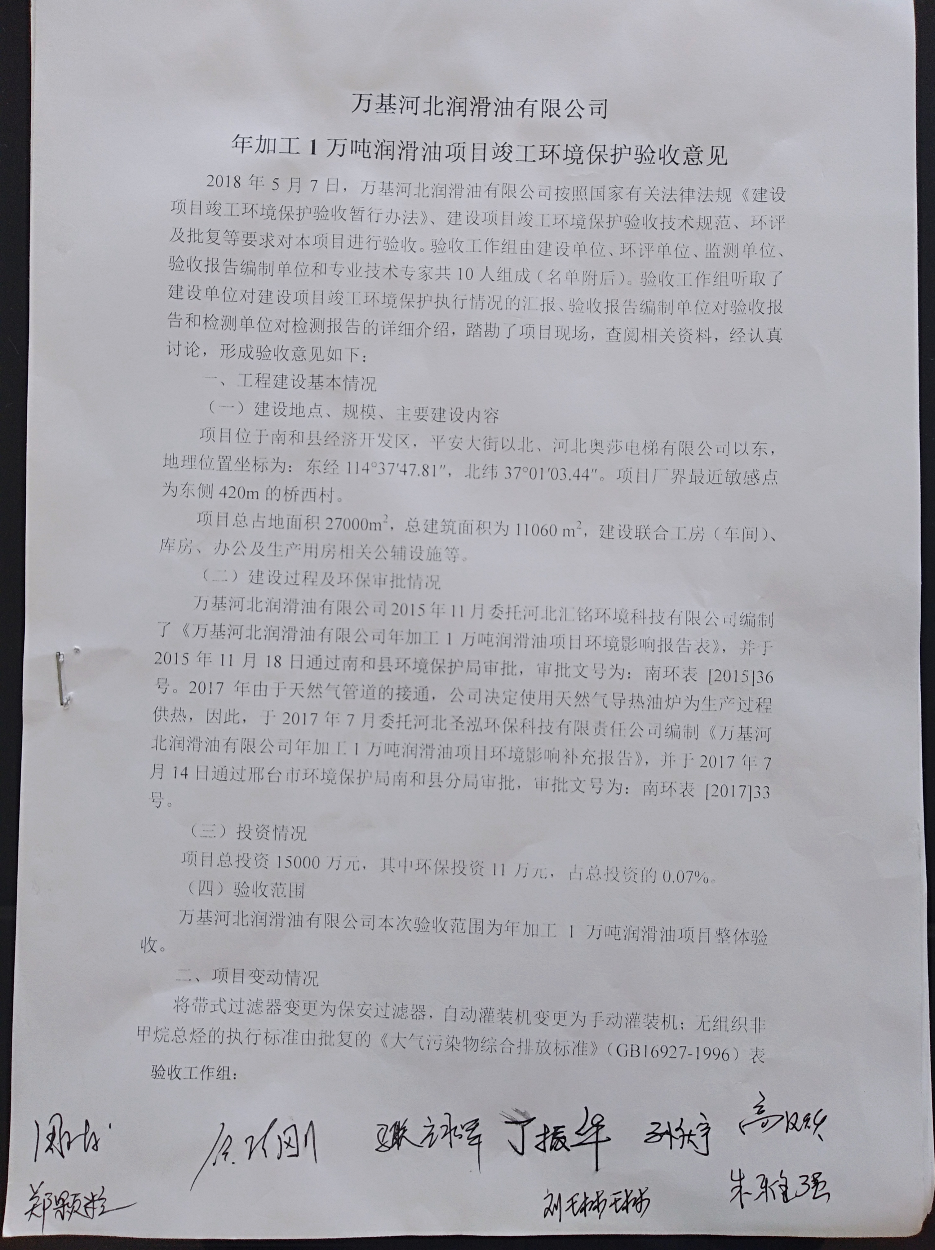 11、 《万基河北润滑油有限公司年加工1万吨润滑油项目环境影响报告表》(河北汇铭环境科技有限公司,2015年11月);