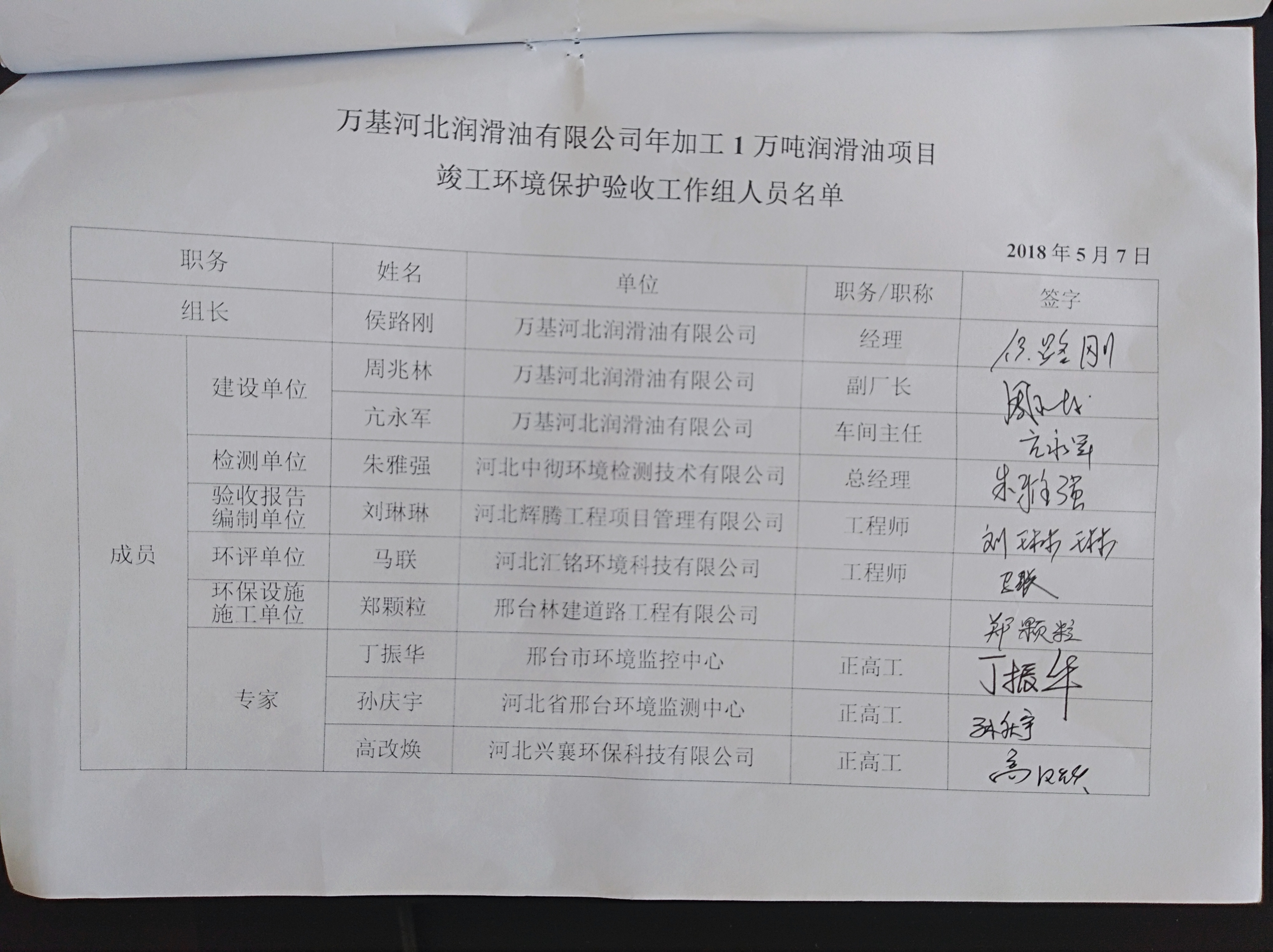 根据《中华人民共和国环境影响评价法(修订)》、 《建设项目环境保护管理条例》 (国务院第682号令)、河北省环境保护厅办公室关于印发《建设项目环境影响评价文件审批及建设单位自主开展环境保护措施验收工作指引 (试行) 》(冀环办字函[2017]727号),受万基河北润滑油有限公司的委托,河北中彻环境检测技术有限公司于2017年12月对现场进行了踏勘, 制定了监测方案, 并分别于2017年12月19日-12月20日对其废气、厂界噪声进行了环保验收监测,河北辉腾工程项目管理有限公司依据监测结果编制了阶段性竣工环境保护验收监测报告, 为其竣工验收提供科学依据。万基河北润滑油有限公司本次验收范围主要为年加工1万吨润滑油项目整体验收。