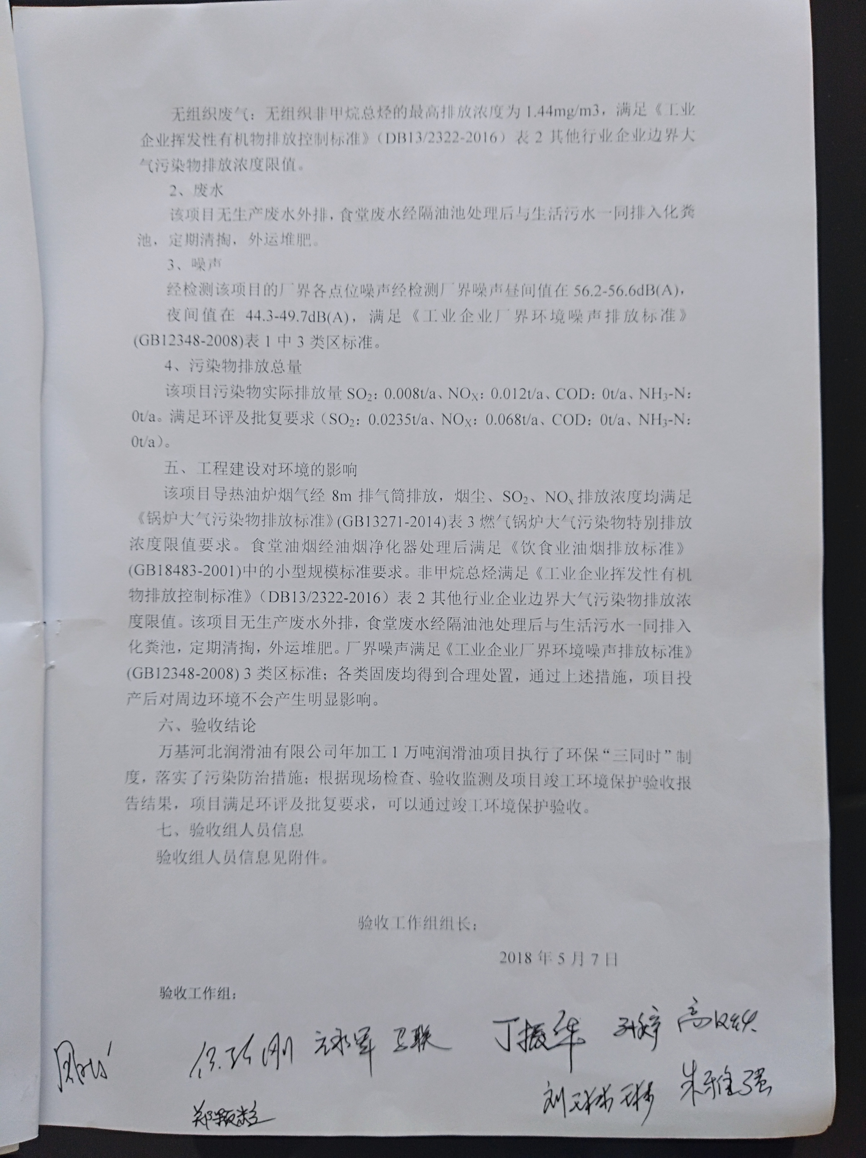 4、 《万基河北润滑油有限公司年加工1万吨润滑油项目验收监测报告》 (河北中彻环境检测技术有限公司(2017)中彻(环监验)字12172,2017年12月22 日)